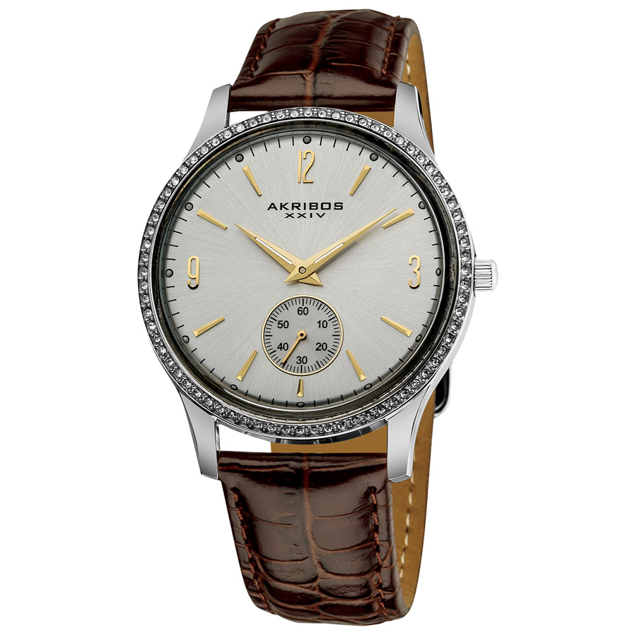 Stainless steel case with a black leather strap. Fixed stainless steel bezel set with crystals. White matte dial with luminous gold-tone hands and index hour markers. Arabic numerals mark the 3, 9 and 12 o'clock positions. Minute markers around the outer rim. Dial Type: Analog. Luminescent markers. Seconds sub-dial at the 6 o'clock position. Quartz movement. Hardened plastic glass crystal. Pull / push crown. Screw down case back. Case diameter: 40 mm. Case thickness: 10 mm. Round case shape. Band width: 20 mm. Band length: 9 inches. Tang clasp. Water resistant at 30 meters / 100 feet. Functions: hour, minute, second. Casual watch style. Akribos XXIV Essential Crystal Quartz Brown Leather Strap Men's Watch AK606BR.