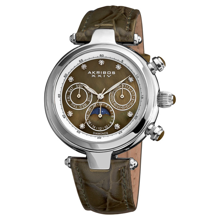 Stainless steel case with a green leather strap. Fixed stainless steel bezel. Green mother of pearl dial with luminous silver-tone hands and diamond hour markers. Minute markers around the outer rim. Dial Type: Analog. Luminescent hands. Three multi-function sub-dials displaying: 24 hour / moonphase, day of the week and date. Automatic movement. Scratch resistant shatter-resistant Krysterna crystal. Push/pull crown. Skeleton case back. Case diameter: 44.5 mm. Case thickness: 13.5 mm. Round case shape. Band width: 22 mm. Band length: 8.5 inches. Tang clasp. Water resistant at 50 meters (165 feet). Functions: hour, minute, second. Dress watch style. Akribos XXIV Ultimate Ladies Watch AK441GN.