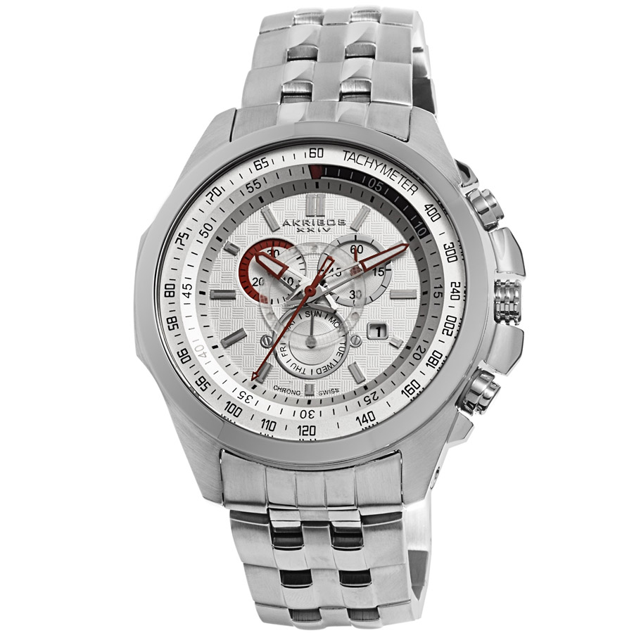 Stainless steel case with a stainless steel bracelet. Fixed stainless steel bezel. White dial with luminous red hands and index hour markers. Minute markers. Tachymeter around the outer rim. Dial Type: Analog. Luminescent hands. Date display at 4 o'clock position. Chronograph - two sub-dials displaying: 60 second and 30 minute. Day of the week sub-dial at the 6 o'clock position.. Quartz movement. Scratch resistant mineral crystal with sapphire coating. Pull / push crown. Screw down case back. Case diameter: 47 mm. Case thickness: 13 mm. Round case shape. Band width: 23 mm. Band length: 8.5 inches. Push-button deployment clasp. Water resistant at 10 atm/100 meters/330 feet. Functions: chronograph, hour, minute, second. Additional Info: subdials: three, date, 60 second and 30 minute timers. Casual watch style. Watch label: Chrono Swiss. Akribos XXIV White Men's Watch AK660SS.
