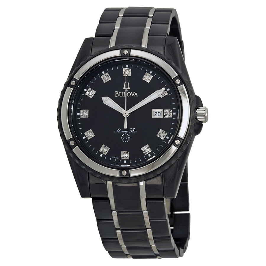 Black ion-plated stainless steel case with a two-tone (silver and black ion-plated) stainless steel bracelet. Fixed silver-tone bezel. Black mother of pearl dial with luminous silver-tone hands and diamond hour markers. Minute markers around the outer rim. Dial Type: Analog. Luminescent hands. Date display at the 3 o'clock position. Quartz movement. Scratch resistant mineral crystal. Solid case back. Case diameter: 44 mm. Case thickness: 11 mm. Round case shape. Band width: 22 mm. Fold over clasp. Water resistant at 100 meters / 330 feet. Functions: date, hour, minute, second. Additional Info: 12 genuine diamond hour marker. date window at 3, hour, minute and second hand.. Casual watch style. Bulova Marine Star Black Mother of Pearl Dial Two-tone Men's Watch 98D107.