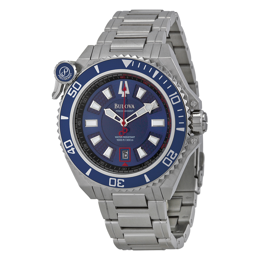 Stainless steel case and bracelet. Unidirectional blue ion-plated bezel with locking leaver. Blue dial with luminous hands and index hour markers. Minute markers around the outer rim. Dial Type: Analog. Luminescent hands and markers. Date display at the 6 o'clock position. Quartz movement. Scratch resistant mineral crystal. Screw down crown. Solid case back. Case diameter: 42 mm. Case thickness: 10 mm. Round case shape. Band width: 24 mm. Band length: 9.75 inches. Fold over clasp. Water resistant at 300 meters / 1000 feet. Functions: date, hour, minute, second. Casual watch style. Bulova Precisionist Catamount Blue Dial Men's Watch 98B168