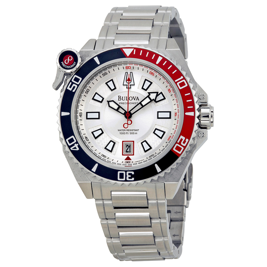 Stainless steel case with a stainless steel bracelet. Fixed stainless steel bezel with black and red top ring. Silver dial with luminous hands and index hour markers. Minute markers around the outer rim. Dial Type: Analog. Luminescent hands and markers. Date display at the 6 o'clock position. Quartz movement. Scratch resistant mineral crystal. Screw down crown. Solid case back. Case diameter: 47 mm. Case thickness: 13 mm. Round case shape. Band width: 23 mm. Band length: 8.5 inches. Deployment clasp. Water resistant at 300 meters / 1000 feet. Functions: hour, minute, second, date. Dress watch style. Bulova Precisionist Silver Dial Stainless Steel Men's Watch 98B167.