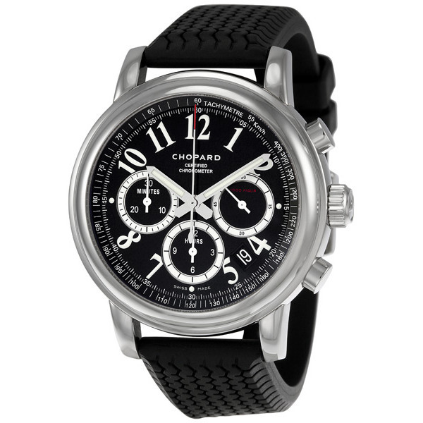 Stainless steel case with a black rubber strap with dunlop tread. Fixed stainless steel bezel. Black dial with luminous hands and Arabic numeral hour markers. Minute markers. Tachymeter around the outer rim. Dial Type: Analog. Luminescent hands and dial markers. Date displays between the 4 and 5 o'clock positions. Chronograph - three sub-dials displaying: 60 second, 30 minute and 12 hour. Automatic mechanical COSC movement with 42 hour power reserve. Scratch resistant sapphire crystal. Stainless steel crown. Transparent case back. Case diameter: 42 mm. Case thickness: 12.3 mm. Round case shape. Band width: 18 mm / 0 mm. Band length: 8.5 inches. Tang clasp. Water resistant at 50 meters / 165 feet. Functions: hours, minutes, seconds, chronograph, tachymeter. Sport watch style. Watch label: Swiss Made. Chopard Mille Miglia Men's Watch 168511-3001.