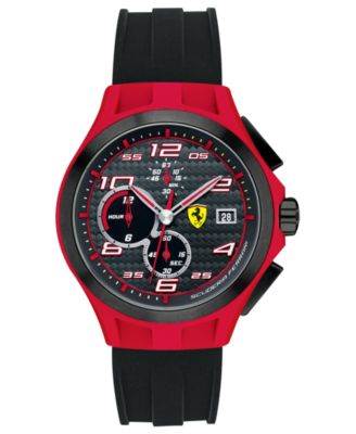 Red tr90 composite case with a black silicone strap (with red backing). Fixed black plastic bezel. Black carbon fiber dial with silver-toned hands and Arabic numeral hour markers. Minute markers around the outer rim. Dial Type: Analog. Luminescent hands and markers. Date display at the 3 o'clock position. Chronograph - three sub-dials displaying: 60 second, 60 minute and 12 hour. Quartz movement. Scratch resistant mineral crystal. Solid case back. Case diameter: 44 mm. Case thickness: 13.5 mm. Round case shape. Band width: 19 mmm. Tang clasp. Water resistant at 50 meters / 165 feet. Functions: chronograph, date, hour, minute, second. Sport watch style. Ferrari Scuderia Chronograph Carbon Fiber Dial Black Silicone Mens Watch 830017.