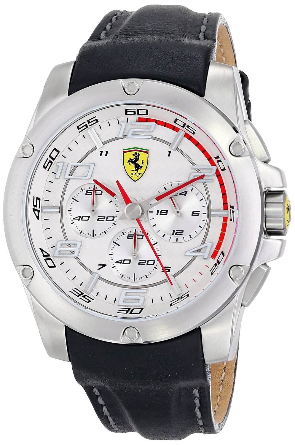 Stainless steel case with a black (calfskin) leather strap. Fixed stainless steel bezel. Silver dial with silver-toned hands and Arabic hour markers. Minute markers around the outer rim. Dial Type: Analog. Luminescent hands and markers. Chronograph - three sub-dials displaying: 60 second, 60 minute and 24 hour. Quartz movement. Scratch resistant mineral crystal. Solid case back. Case diameter: 46 mm. Case thickness: 13.5 mm. Round case shape. Band width: 24 mm. Deployment clasp. Water resistant at 50 meters / 165 feet. Functions: chronograph, hour, minute, second. Sport watch style. Ferrari Scuderia Silver Dial Chronograph Black Leather Mens Watch 830090.