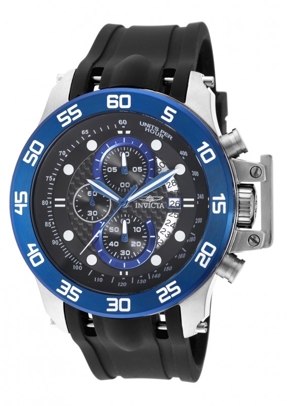 Stainless steel case with a black polyurethane bracelet. Blue ion-plated bezel. Black carbon fiber dial with luminous blue hands and dot hour markers. Tachymeter around the outer rim. Dial Type: Analog. Luminescent hands and markers. Date display at the 3 o'clock position. Chronograph - three sub-dials displaying: 60 second, 60 minute and 1/10th of a second. Quartz movement. Scratch resistant flame fusion crystal. Screw down crown. Solid case back. Case diameter: 51 mm. Round case shape. Band width: 26 mm. Band length: 8.25 inches. Tang clasp. Water resistant at 100 meters / 330 feet. Functions: chronograph, tachymeter, date, hour, minute, second. Casual watch style. Invicta I-Force Chronograph Black Dial Black Polyurethane Men's Watch 19252.