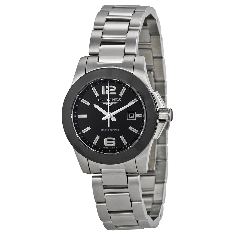 Stainless steel case with a stainless steel bracelet. Fixed black ceramic bezel. Black dial with silver-toned hands and index hour markers. Arabic numerals mark the 6 and 12 o'clock positions. minute markers around the outer rim. Dial Type: Analog. Luminescent hands and markers. Date display at the 3 o'clock position. Quartz movement. Scratch resistant sapphire crystal. Screw down crown. Solid case back. Case diameter: 29 mm. Round case shape. Deployment clasp. Water resistant at 300 meters / 1000 feet. Functions: date, hour, minute, second. Luxury watch style. Watch label: Swiss Made. Item Variations: L3.257.4.56.6. Longines Conquest Black Dial Stainless Steel Ladies Watch L32574566.