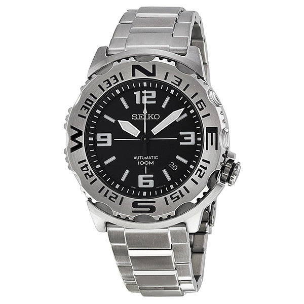 Stainless steel case with a stainless steel bracelet. Uni-directional rotating stainless steel bezel with compass markings. Black dial with luminous silver-tone hands and index hour markers. Arabic numerals mark the 3, 6, 9 and 12 o'clock positions. Minute markers around the outer rim. Dial Type: Analog. Luminescent hands and markers. Date display between 4 and 5 o'clock position. Automatic movement. Scratch resistant Hardlex crystal. Pull / push crown. Skeleton case back. Case diameter: 47 mm. Case thickness: 13 mm. Round case shape. Deployment clasp with push button release. Water resistant at 100 meters / 330 feet. Functions: date, hour, minute, second, compass. Sport watch style. Seiko Black Dial Stainless Steel Compass Men's Watch SRP441.