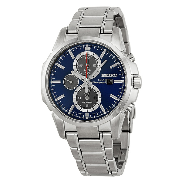 Stainless steel case with a stainless steel bracelet. Fixed stainless steel bezel. Blue dial with luminous silver-tone hands and stick hour markers. Minute markers around the outer rim. Dial Type: Analog. Luminescent hands and markers. Date display at the 3 o'clock position. Chronograph - three sub-dials displaying: 60 second, 60 minute and 12 hour (alarm). Automatic movement. Scratch resistant Hardlex crystal. Pull / push crown. Solid case back. Case diameter: 42 mm. Case thickness: 13 mm. Round case shape. Band width: 19 mm. Fold over clasp with safety release. Water resistant at 100 meters / 330 feet. Functions: chronograph, date, hour, minute, second. Casual watch style. Seiko Solar Chronograph Blue Dial Stainless Steel Men's Watch SSC085.