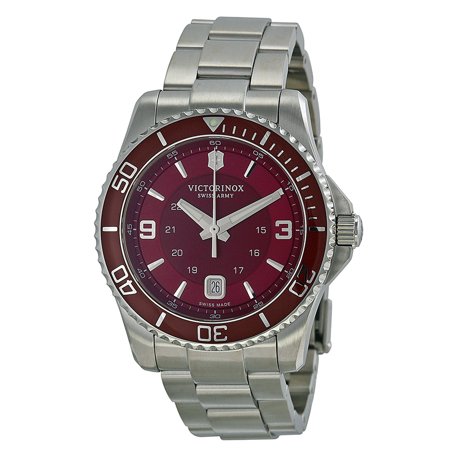Stainless steel case with a stainless steel bracelet. Uni-directional rotating stainless steel bezel with red ion-plated top ring. Red dial with silver-tone hands and stick hour markers. 24 hour markers. Arabic numerals mark the 3 and 9 o'clock positions. Minute markers around the outer rim. Dial Type: Analog. Luminescent hands and markers. Date display at the 6 o'clock position. Quartz movement. Scratch resistant sapphire crystal. Solid case back. Case diameter: 43 mm. Case thickness: 12 mm. Round case shape. Band width: 20 mm. Deployment with push button clasp. Water resistant at 100 meters / 330 feet. Functions: date, hour, minute, second. Casual watch style. Watch label: Swiss Made. Victorinox Maverick GS Red Dial Stainless Steel Men's Watch 241604.