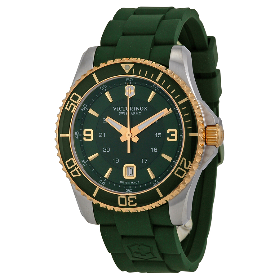 Stainless steel case with a green rubber strap. Uni-directional rotating green PVD bezel. Green dial with luminous gold-tone hands and index hour markers. Arabic numerals mark the 3 and 6 o'clock positions. Military time markings. Minute markers around the outer rim. Dial Type: Analog. Luminescent hands and markers. Date display at the 6 o'clock position. Quartz movement. Scratch resistant sapphire crystal. Screw down crown. Solid case back. Case diameter: 43 mm. Case thickness: 20 mm. Round case shape. Band width: 21.6 mm. Band length: 8.5 inches. Tang clasp. Water resistant at 100 meters / 330 feet. Functions: date, hour, minute, second, mt. Casual watch style. Watch label: Swiss Made. Victorinox Swiss Army Maverick Green Dial Green Rubber Men's Watch 241606.