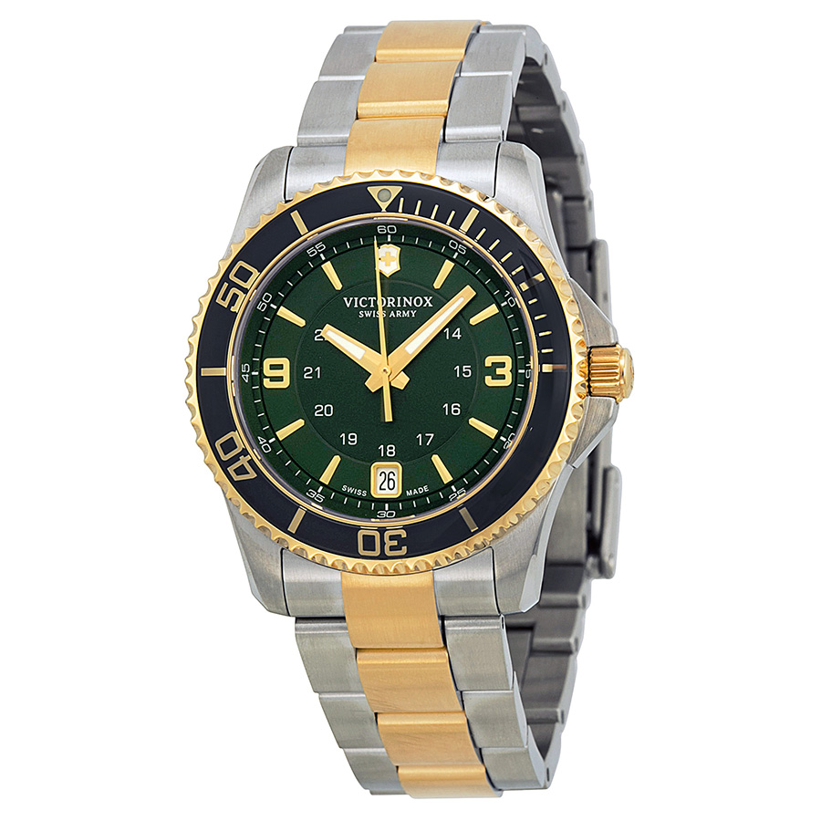 Stainless steel case with a two-tone (silver and gold PVD) stainless steel bracelet. Uni-directional rotating green PVD bezel. Green dial with gold-tone hands and index hour markers. Arabic numerals mark the 3 and 6 o'clock positions. military time markings. minute markers around the outer rim. Dial Type: Analog. Luminescent hands and markers. Date display at the 6 o'clock position. Quartz movement. Scratch resistant sapphire crystal. Screw down crown. Solid case back. Case diameter: 34 mm. Case thickness: 10 mm. Round case shape. Band width: 18 mm. Deployment clasp. Water resistant at 100 meters / 330 feet. Functions: date, hour, minute, second, mt. Casual watch style. Watch label: Swiss Made. Victorinox Swiss Army Maverick GS Green Dial Two-tone Ladies Watch 241612.