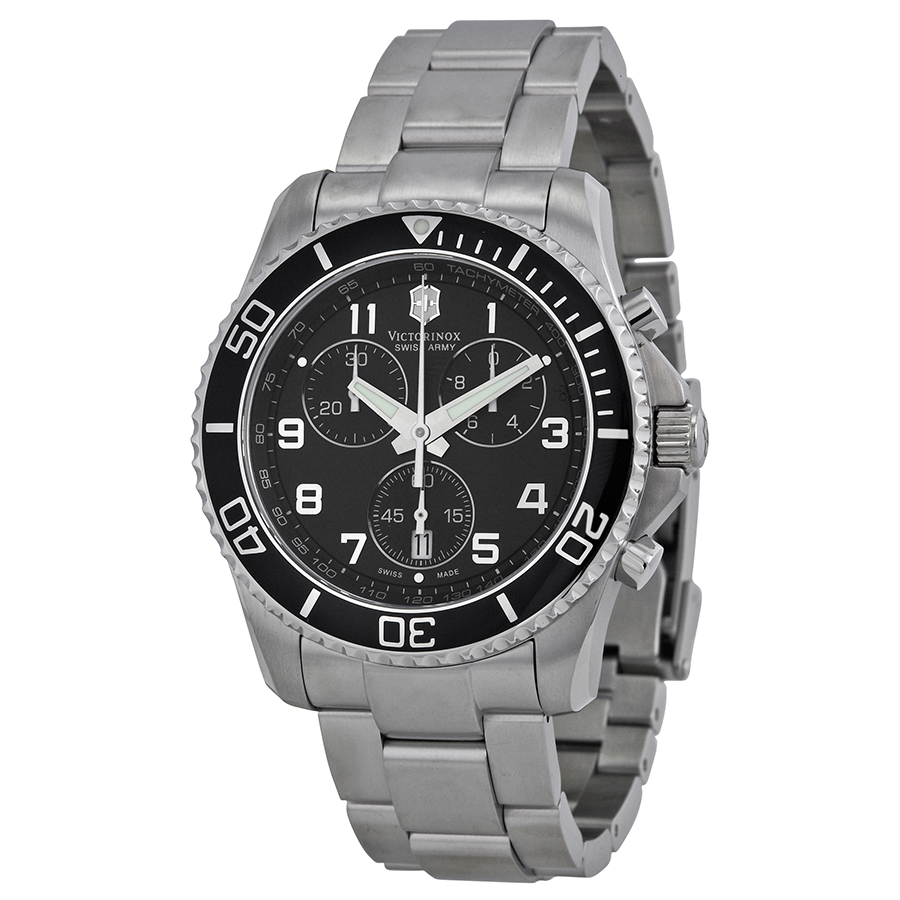 Stainless steel case with a stainless steel bracelet. Unidirectional rotating black ion-plated bezel. Black dial with luminous hands and Arabic numeral hour markers. Minute markers. Tachymeter around the outer rim. Dial Type: Analog. Luminescent hands and markers. Date displays at the 6 o'clock position. Chronograph - three sub-dials displaying: 1/10th seconds, 30 minutes, 60 seconds sub dials. Quartz movement. Scratch resistant sapphire crystal. Pull / push crown. Solid case back. Case diameter: 43 mm. Case thickness: 12 mm. Round case shape. Band width: 22 mm. Fold over clasp with push button release. Water resistant at 100 meters / 330 feet. Functions: hours, minutes, seconds, date, chronograph, tachymeter. Casual watch style. Watch label: Swiss Made. Victorinox Swiss Army Maverick GS Men's Watch 241432.