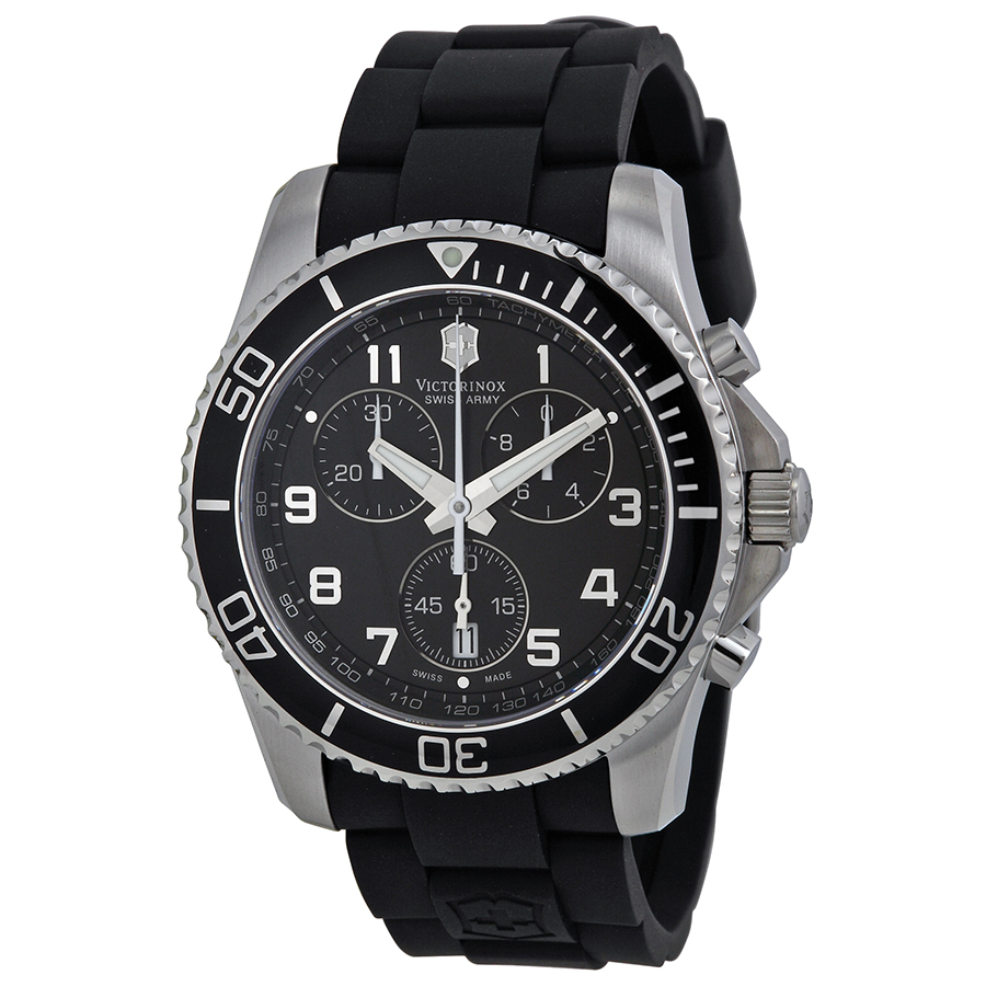 Stainless steel case with a black rubber strap. Fixed stainless steel bezel with a black top ring. Black dial with luminous hands and Arabic numeral hour markers. Minute markers. tachymeter around the outer rim. Dial Type: Analog. Luminescent hands and markers. Date display at the 6 o'clock position. Chronograph - three sub-dials displaying: 60 seconds, 60 minutes and 1/10th of a second. Battery operated quartz movement. Scratch resistant anti-reflective sapphire crystal. Pull / push crown. Screw in case back. Case diameter: 43 mm. Round case shape. Band width: 22 mm. Tang clasp. Water resistant at 100 meters / 330 feet. Functions: second, chronograph, date, hour, minute. Sport watch style. Watch label: Swiss Made. Victorinox Swiss Army Maverick GS Men's Watch 241431.