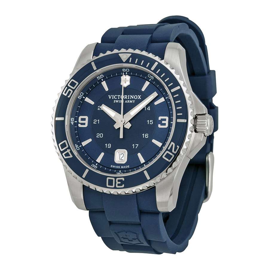 Stainless steel case with a blue rubber strap. Uni-directional rotating navy PVD bezel. Navy dial with luminous silver-tone hands and index hour markers. Arabic numerals mark the 3 and 9 o'clock positions. militry time markers. minute markers around the outer rim. Dial Type: Analog. Luminescent hands and markers. Date display at the 6 o'clock position. Quartz movement. Scratch resistant sapphire crystal. Screw down crown. Solid case back. Case diameter: 43 mm. Round case shape. Band width: 20 mm. Tang clasp. Water resistant at 100 meters / 330 feet. Functions: date, hour, minute, second, mt. Casual watch style. Watch label: Swiss Made. Victorinox Swiss Army Maverick GS Navy Dial Navy Blue Rubber Men's Watch 241603.