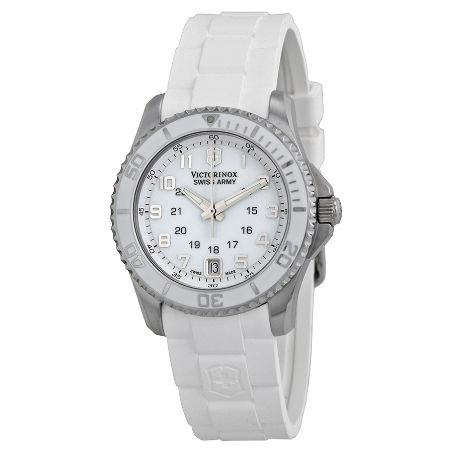 Stainless steel case with a white rubber strap. Uni-directional rotating bezel with a white lacquer finish. Mother of pearl dial with silver-tone hands and Arabic numeral hour markers. 24 hour scale. Minute markers around the outer rim. Dial Type: Analog. Luminescent hands and markers. Date display at the 6 o'clock position. Quartz movement. Scratch resistant sapphire crystal. Protected steel crown. Solid case back. Case diameter: 33 mm. Case thickness: 9 mm. Band width: 17 mm. Tang clasp. Water resistant at 100 meters / 330 feet. Functions: date,24 hour, hour, minute, second. Casual watch style. Victorinox Swiss Army Maverick Mother of Pearl Dial Ladies Watch 241492.