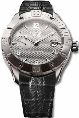 Stainless steel case with a black leather strap strap. Graduated, unidirectional rotating bezel. Silver guilloche dial with alternating stick and Arabic numeral hour markers. Dial Type: Analog. Luminescent hands and markers. Date at the 3 o'clock. 30-seconds. Automatic movement. Elite 680 sc, 55 hour of power reserve engine. Scratch resistant sapphire crystal. Screw-in, engraved with zenith star crown. Transparent sapphire case back. Case diameter: 43mm. Round case shape. Triple-folding buckle clasp. Water resistant at 300 meters / 1000 feet. Functions: date, hour, minute, second. Sport watch style. Watch label: Swiss Made. Zenith Defy Classic Elite HMS Men's Watch 03051668001C648.