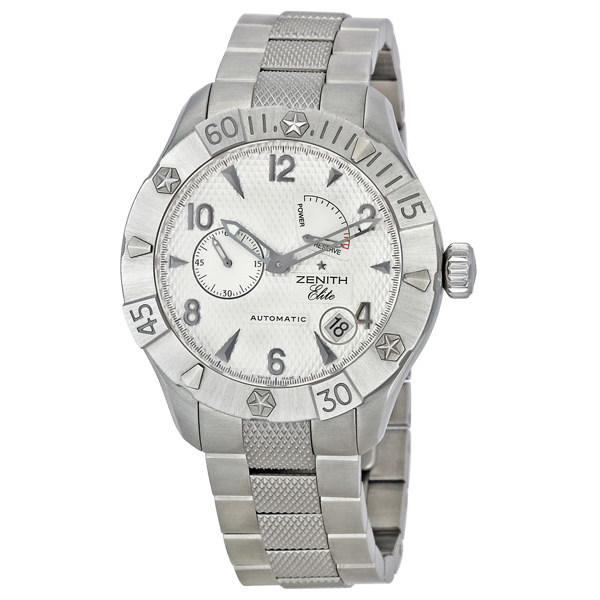 Stainless steel case with a stainless steel bracelet. Unidirectional turning bezel. Silver guilloche dial with luminous hands and Arabic numeral and stick hour markers. Date displays at the 4 o'clock position. Two sub-dials displaying: small seconds and power reserve sub dial. Automatic movement. Scratch resistant sapphire crystal. Case diameter: 43 mm. Triple folding clasp. Water resistant at 300 meters/ 1000 feet. Functions: hours, minutes, small seconds, power reserve. Zenith Defy Men's Watch 03051668501M526.